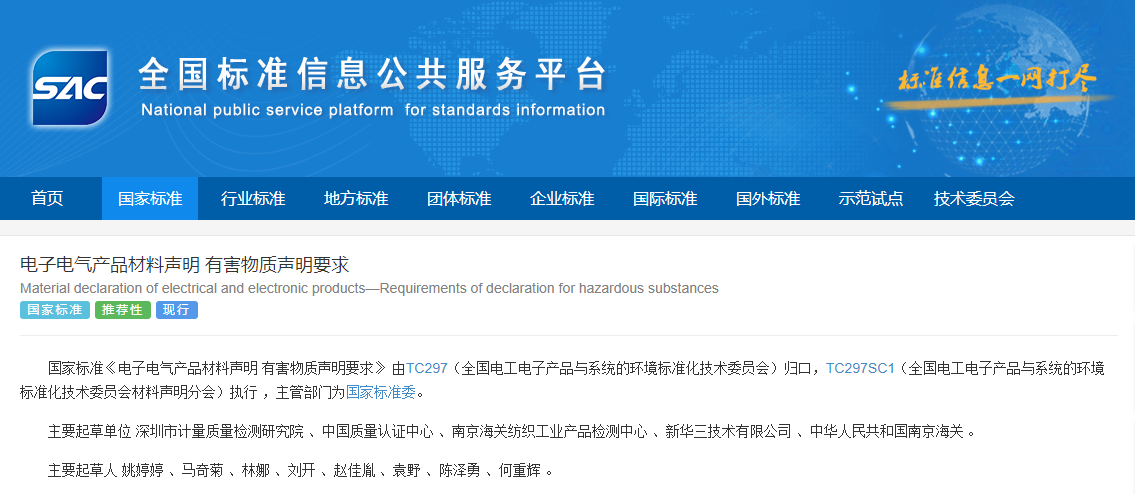全国电工电子产品与系统的环境标准化技术委员会材料声明分会 国家标准化管理委员会于2024年09月29日发布GB/T 44652-2024《电子电气产品材料声明 有害物质声明要求》,发布日期2024-09-29 实施日期2024-09-29.