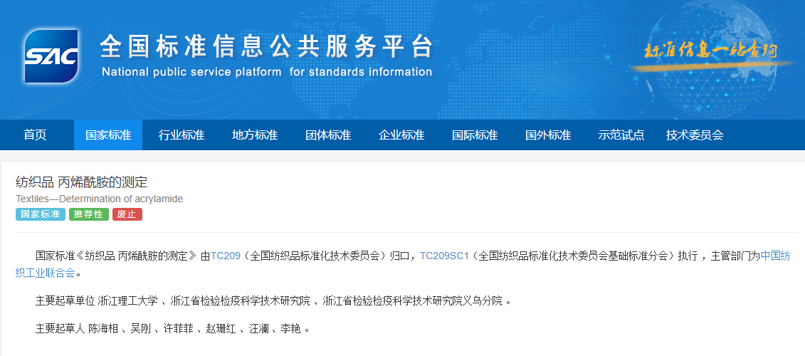 全国纺织品标准化技术委员会基础标准分会 国家标准化管理委员会于2024年10月15日发布GB/T 30166-2024 《纺织品 丙烯酰胺的测定》,代替GB/T 30166-2013 ,强制实施日期为 2024年10月15日,同时GB/T 30166-2013作废。